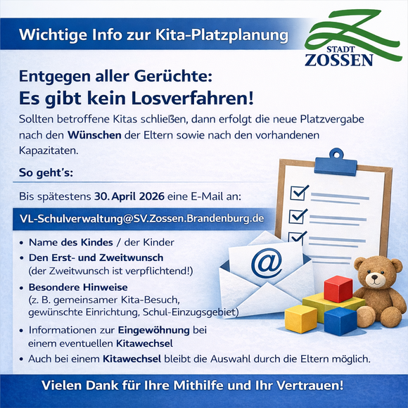 Willkommen auf www.zossen.de, dem offiziellen Internetportal der Stadt Zossen. Hier erhalten Sie einen umfassenden Überblick über die Stadtverwaltung und alle wichtigen Dienstleistungen für Bürgerinnen, Bürger, Unternehmen und Gäste.