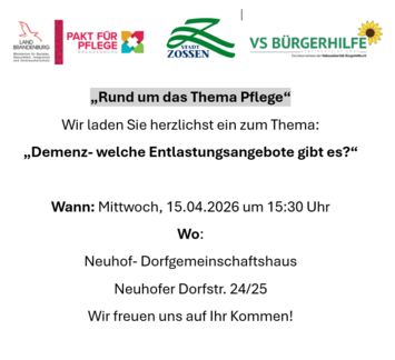 Am 15. April 2026 wird ab 15:30 Uhr im Dorfgemeinschaftshaus Neuhof (Neuhofer Dorfstraße 24/25) das Thema „Demenz – welche Entlastungsangebote gibt es?“ vorgestellt.