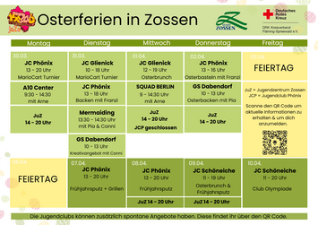 Auch in diesem Jahr erwartet Kinder und Jugendliche in den Osterferien ein abwechslungsreiches Programm in Zossen und den Ortsteilen. Gemeinsam mit der Jugendsozialarbeit JaZO und den Jugendclubs wurde ein vielfältiges Ferienangebot organisiert.