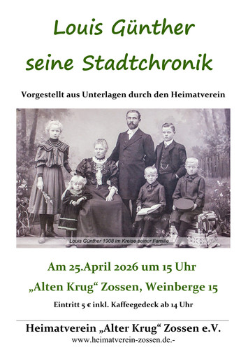 Der Heimatverein „Alter Krug“ Zossen e. V. lädt am Sonnabend, 25. April 2026, ins Heimatmuseum ein: Im Mittelpunkt steht die Stadtchronik von Louis Günther, die auf Grundlage historischer Unterlagen vorgestellt wird.