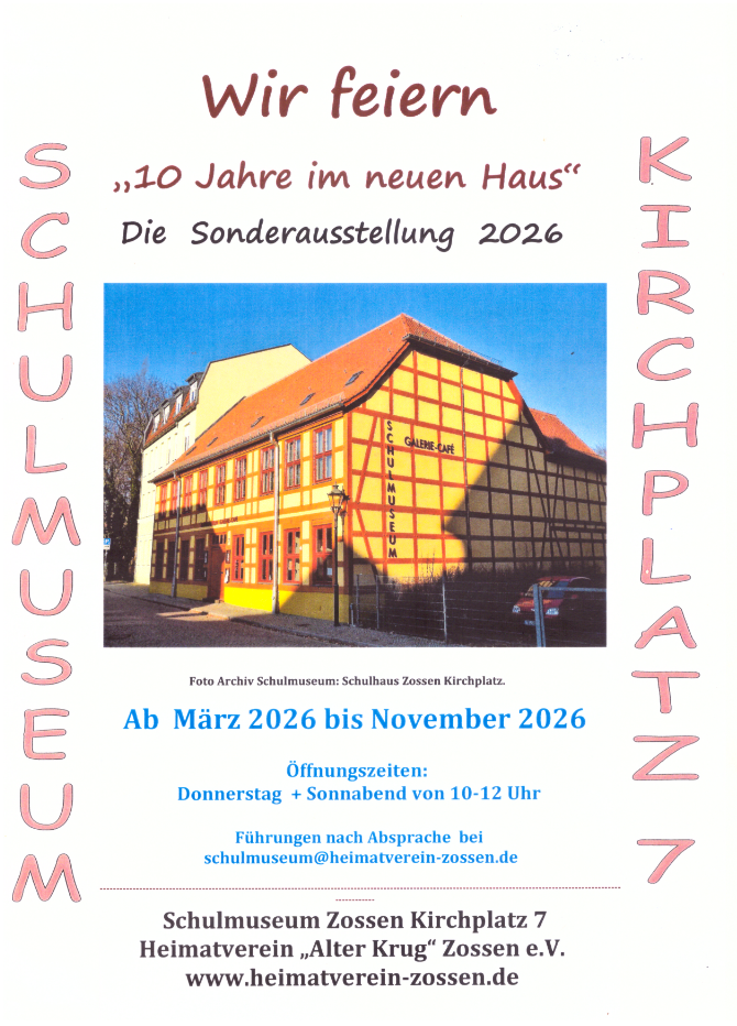 Führungen sind nach vorheriger Absprache per E-Mail an schulmuseum@heimatverein-zossen.de möglich.