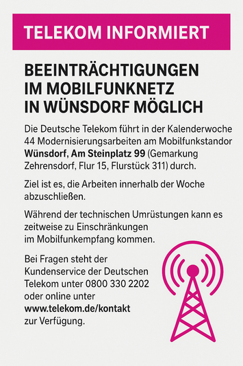 Telekom informiert über mögliche Beeinträchtigungen durch Modernisierungsarbeiten in Wünsdorf