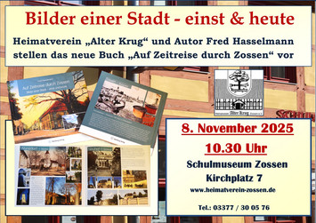 Es ist noch druckfrisch – das neue, vom Zossener Heimatverein „Alter Krug“ herausgegebene Buch „Auf Zeitreise durch Zossen – Bilder einer Stadt einst und heute“. Erstmals vorgestellt wird es am 8. November 2025 ab 10.30 Uhr im Schulmuseum, Kirchplatz 7. Autor und Fotograf des 72-seitigen Buches ist der seit 2008 in Zossen lebende Journalist Fred Hasselmann, der in Zusammenarbeit mit dem Heimatverein bereits im Jahr 2014 für das Buch „Zossen und seine Ortsteile – Auf den Spuren historischer…