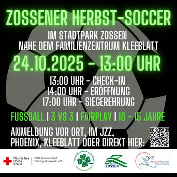 Am 24. Oktober 2025 rollt der Ball beim Zossener Herbst-Soccer im Stadtpark nahe dem Familienzentrum Kleeblatt.