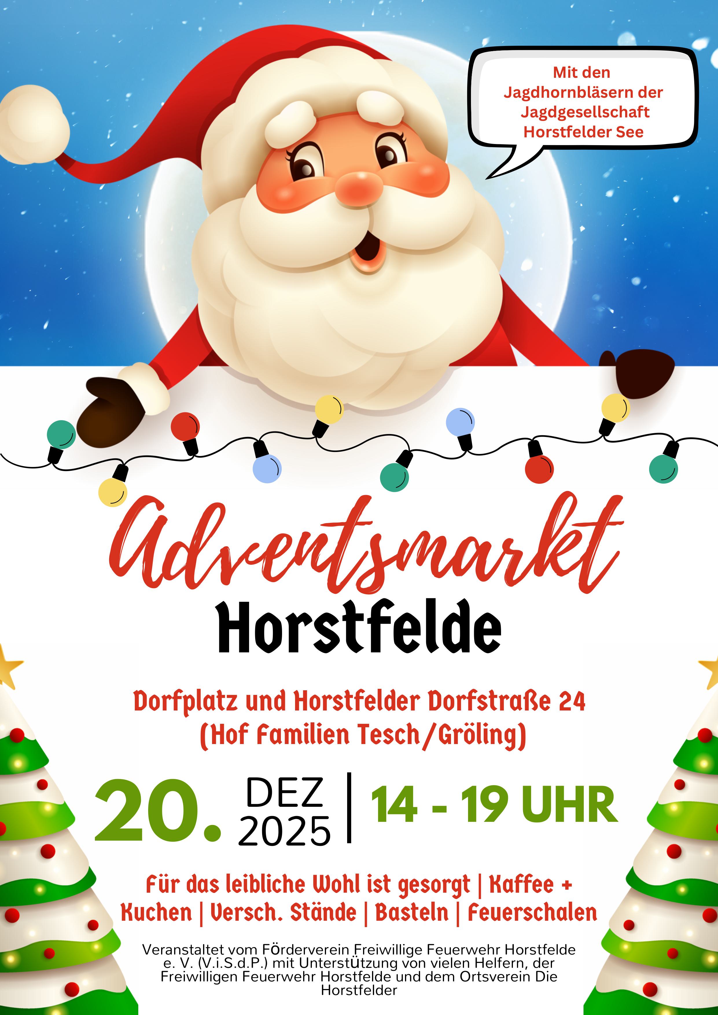 Adventsmarktstimmung in Horstfelde: Am 20. Dezember 2025 findet auf dem Dorfplatz und Horstfelder Dorfstraße 24 (Hof Familien Tesch / Gröling) ein stimmungsvoller Adventsmarkt statt. Von 14 bis 19 Uhr erwartet Besucherinnen und Besucher ein abwechslungsreiches Angebot mit Kaffee und Kuchen, verschiedenen Verkaufsständen, Bastelaktionen und wärmenden Feuerschalen. Für musikalische Untermalung sorgen die Jagdhornbläser der Jagdgesellschaft Horstfelder See .