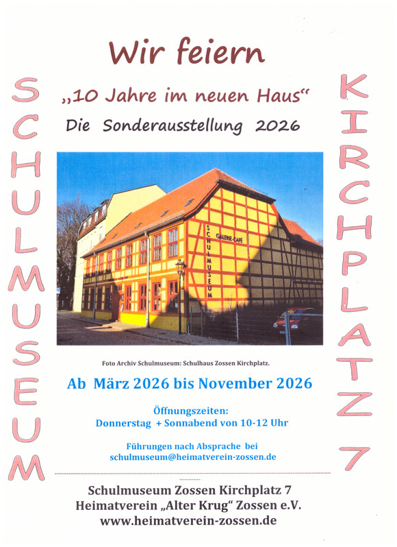 Führungen sind nach vorheriger Absprache per E-Mail an schulmuseum@heimatverein-zossen.de möglich.