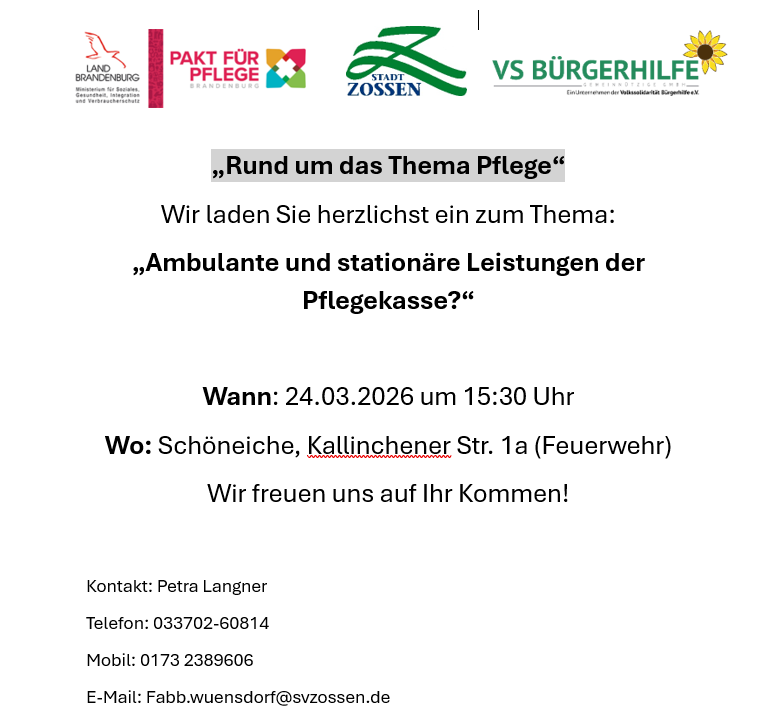 Die Informations- und Beratungsreihe „Rund um das Thema Pflege“ wird fortgesetzt und macht heute Station in Schöneiche.