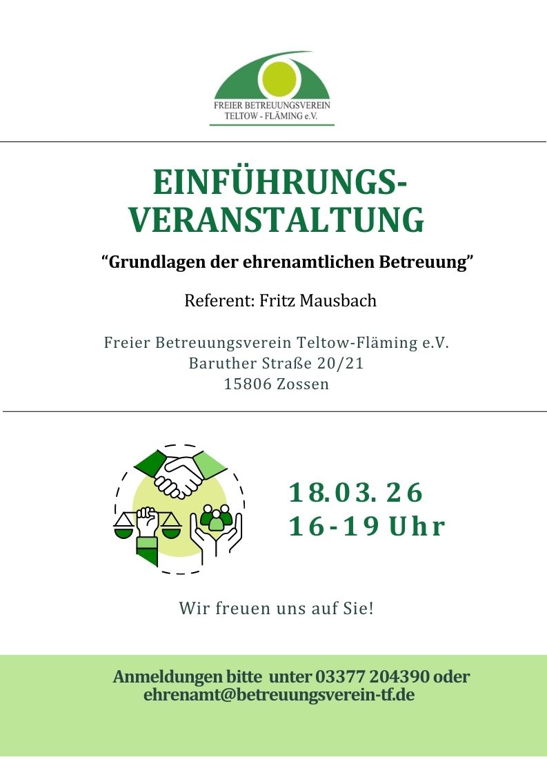 Am 18. März 2026 in der Zeit von 16 - 19 Uhr findet die nächste Einführungsveranstaltung für neue und interessierte Ehrenamtliche statt. Die Schulung vermittelt grundlegendes Wissen zu den Aufgaben, Rechten und Pflichten in der ehrenamtlichen Betreuung sowie praktische Hinweise für den Betreuungsalltag. Auch bereits aktive Betreuerinnen und Betreuer sind herzlich eingeladen, ihr Wissen aufzufrischen und Fragen einzubringen.
