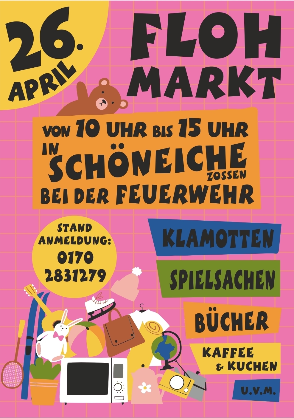 Am 26. April findet von 10 bis 15 Uhr ein Flohmarkt in Schöneiche bei der Feuerwehr statt. Angeboten werden unter anderem Kleidung, Spielsachen und Bücher. Für das leibliche Wohl ist mit Kaffee und Kuchen gesorgt.