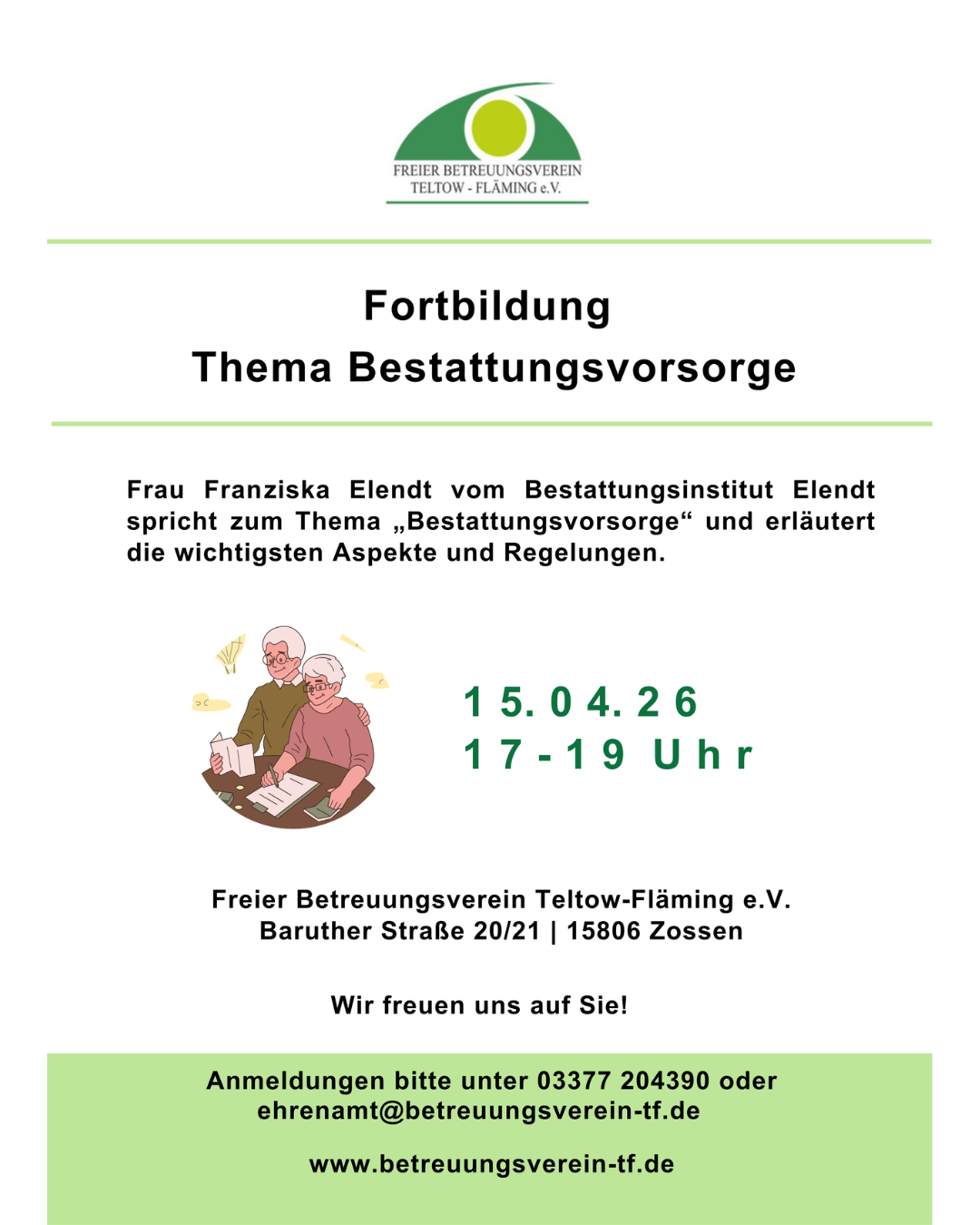 Der Freie Betreuungsverein Teltow-Fläming e. V. lädt am 15. April 2026 zu einer Informationsveranstaltung zum Thema Bestattungsvorsorge ein.