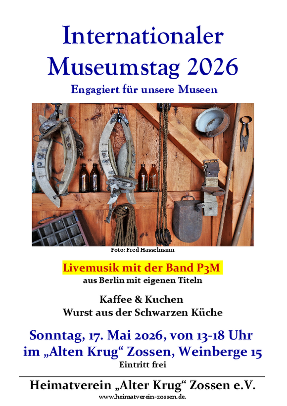 Das Museum „Alter Krug“ beteiligt sich erstmals seit vielen Jahren wieder am Internationalen Museumstag am 17. Mai 2026. Unter dem diesjährigen Motto „Engagiert für unsere Museen“ öffnet der "Alte Krug", Weinberge 15 in Zossen, ab 13 Uhr seine Türen.