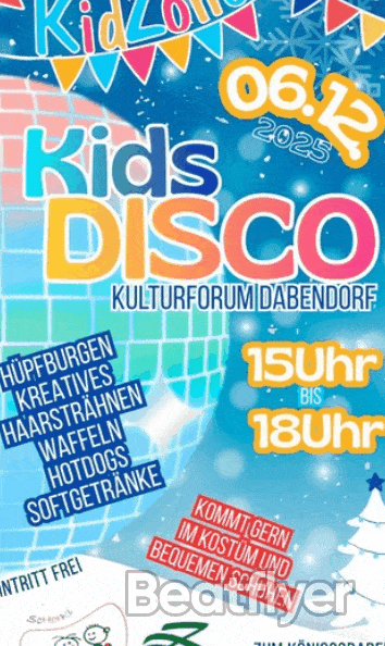 Am 6. Dezember 2025 lädt die KidZone zur großen Kids Disco ins Kulturforum Dabendorf ein. Von 15:00 bis 18:00 Uhr steht alles im Zeichen von Musik, Bewegung und Spaß – ein Nachmittag für Kinder, die tanzen, spielen und feiern möchten.