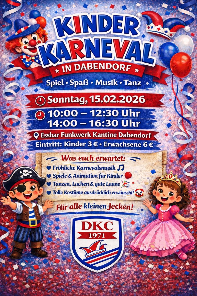 Bunt, fröhlich und voller Bewegung: Am 15. Februar 2026 lädt der Kinderkarneval in Dabendorf zu einem abwechslungsreichen Programm für kleine Jecken ein. In der Kantine „Essbar“ am Funkwerk Dabendorf stehen fröhliche Karnevalsmusik, Spiele und Animationen für Kinder sowie jede Menge gute Laune auf dem Programm. Fantasievolle Kostüme sind ausdrücklich erwünscht!