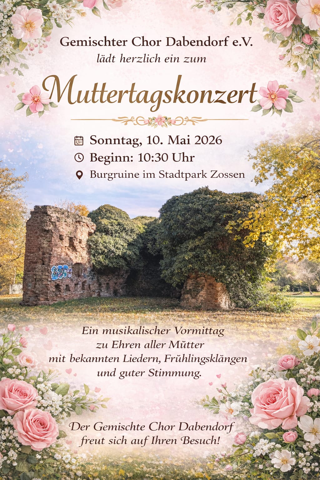 Muttertag mal anders! Besuchten Sie das Chorkonzert am Sonntag, 10. Mai 2026, ab 10:30 Uhr im Stadtpark Zossen. Der gemischte Chor aus Dabendorf wird Sie mit bekannten Liedern, Frühlingsklängen und guter Stimmung verzaubern.