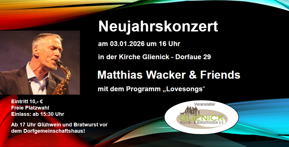 Am Samstag, 3. Januar 2026, lädt der Kultur- & Bürgerverein Glienick e. V. zum Neujahrskonzert in die Kirche Glienick, Dorfaue 29. Ab 16 Uhr präsentieren Matthias Wacker & Friends ihr Programm „Lovesongs“ – das einen stimmungsvollen Start ins neue Jahr verspricht.