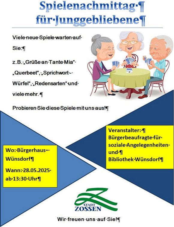 Am 28. Mai 2025 lädt die Bürgerbeauftragte für soziale Angelegenheiten der Stadt Zossen gemeinsam mit der Bibliothek Wünsdorf zu einem geselligen Spielenachmittag für Junggebliebene ein.