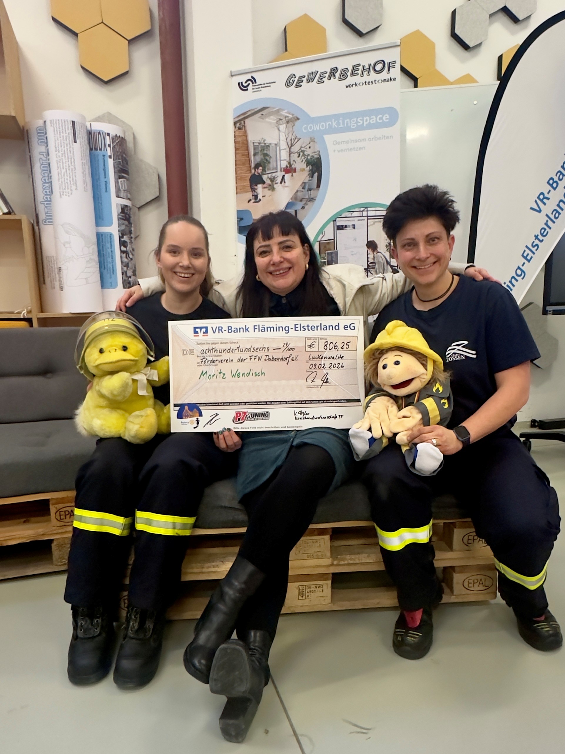 Zu den Spendenempfängern zählt auch die Zwergen- und Jugendfeuerwehr Dabendorf, vorgeschlagen von Projektteilnehmer Moritz Franz Wendisch. Gemeinsam mit Stefanie Tabbert und Lara Haack nahm Zossens Bürgermeisterin Wiebke Şahin-Connolly den symbolischen Spendenscheck entgegen.