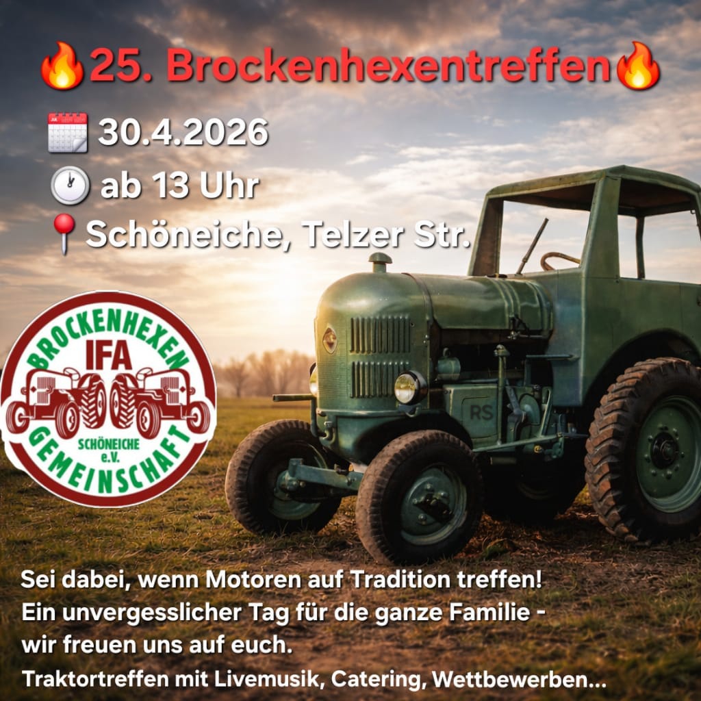 Am 30.4.2026 findet das traditionelle Brockenhexentreffen im Ortsteil Schöneiche statt. Ein besonderes Jubiläum steht bevor: Zum 25. Mal findet in diesem Jahr das beliebte Traktortreffen statt.