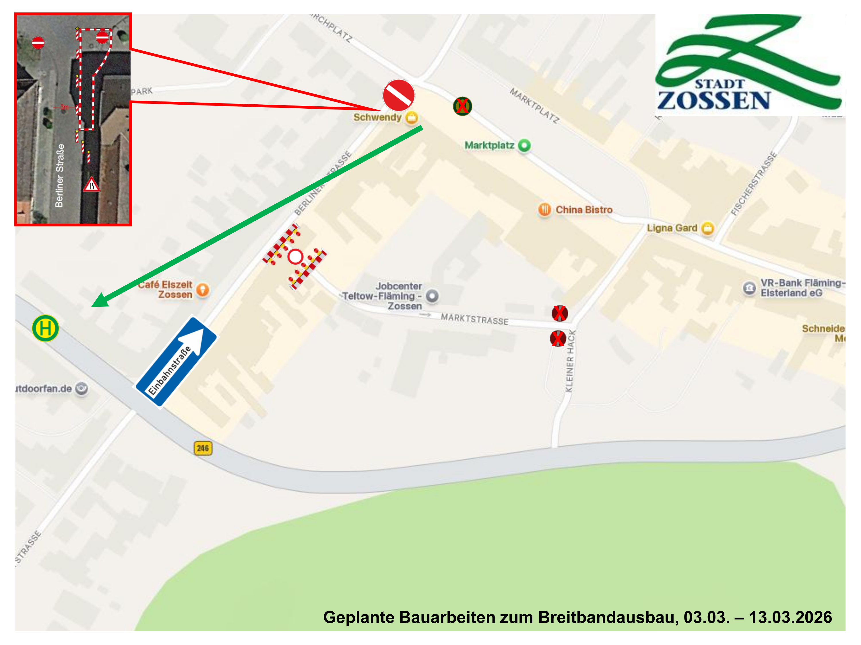 Für den weiteren Ausbau des Breitbandnetzes sind in der Innenstadt von Zossen Bauarbeiten geplant. Damit verbunden sind vorübergehende Änderungen in der Verkehrsführung.