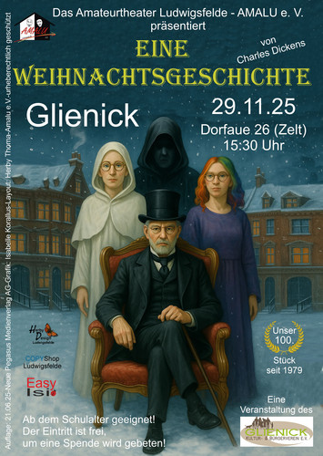 Auf dem Glienicker Weihnachtsmarkt wird es in diesem Jahr wieder eine besondere Theateraufführung geben. Das Amateurtheater Ludwigsfelde – AMALU e. V. präsentiert am 29. November 2025 das beliebte Stück „Eine Weihnachtsgeschichte“ von Charles Dickens.