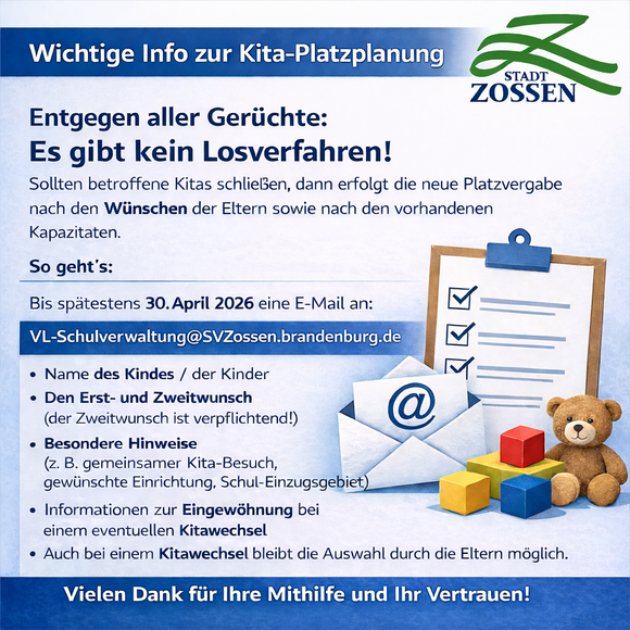 Willkommen auf www.zossen.de, dem offiziellen Internetportal der Stadt Zossen. Hier erhalten Sie einen umfassenden Überblick über die Stadtverwaltung und alle wichtigen Dienstleistungen für Bürgerinnen, Bürger, Unternehmen und Gäste.